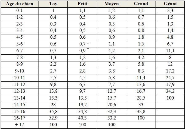 Tableau de comparaison entre l’âge d’un chien (selon sa taille) et l’âge humain.