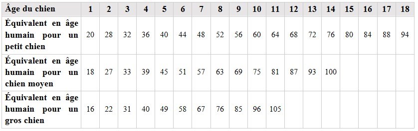 Contrairement à ce que l’on croit, il ne suffit pas de multiplier par 7 l’âge du chien pour obtenir son âge « humain » car il n’ a pas de relation linéaire entre les deux. En revanche, on peut utiliser le tableau suivant.