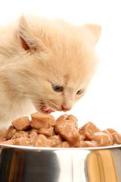 Les besoins nutritionnels du chaton sont spécifiques : l'aliment doit contenir beaucoup de lipides et de protéines, des acides aminés en quantité élevée (en particulier : arginine, tryptophane, taurine) et des vitamines liposolubles A et D sous leur forme animale et non végétale.