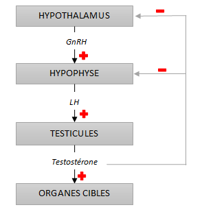 La production de testostérone est sous le contrôle de la LH (Luteinizing Hormone, hormone lutéinisante), produite au niveau de l’hypophyse, elle-même sous le contrôle de la GnRH (Gonadotropin Releasing Hormone ou gonadolibérine) produite au niveau de l’hypothalamus. En simplifiant, la GnRH stimule la synthèse et la sécrétion de la LH par l’hypophyse et la LH stimule la production de testostérone par les testicules. Il existe un « rétrocontrôle négatif » : la testostérone inhibe la sécrétion hypothalamique de GnRH et la sécrétion hypophysaire de LH. Ainsi le taux de testostérone dans le sang est maintenu constant.