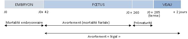 L’avortement est l’expulsion d’un fœtus ou d’un veau, soit né mort, soit mourant dans les 48 heures qui suivent sa naissance. Cette définition inclut donc tous les fœtus de plus de 42 jours nés avant terme, viables ou non.
